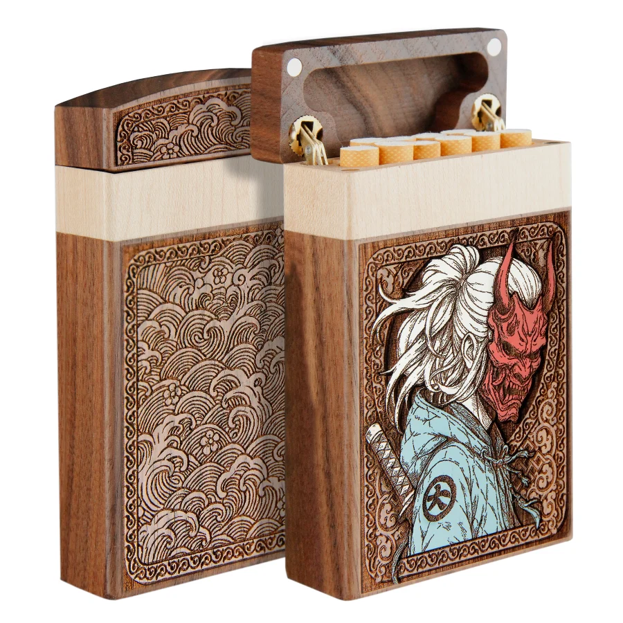 Our cigarette cases are made of genuine natural fir and mahogany wood, engraved with millimeter precision and hand-painted with high-quality acrylic paints,