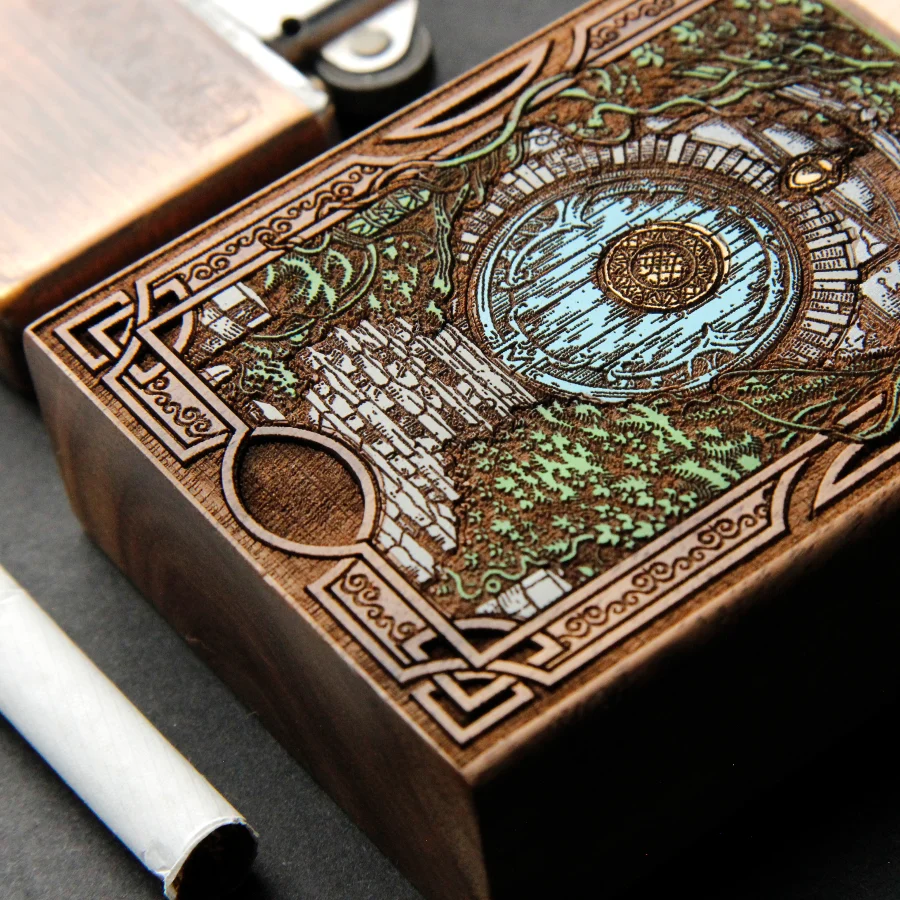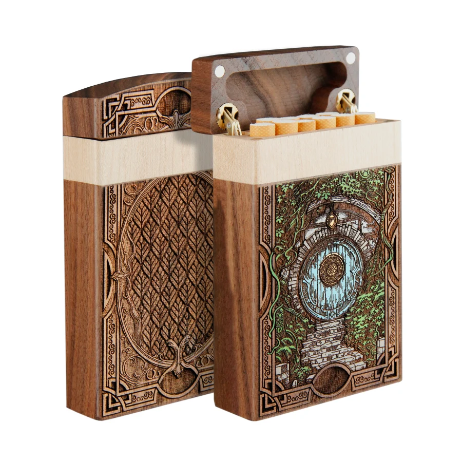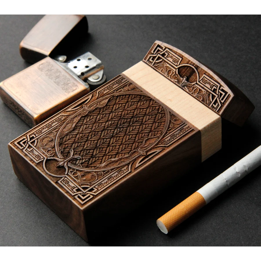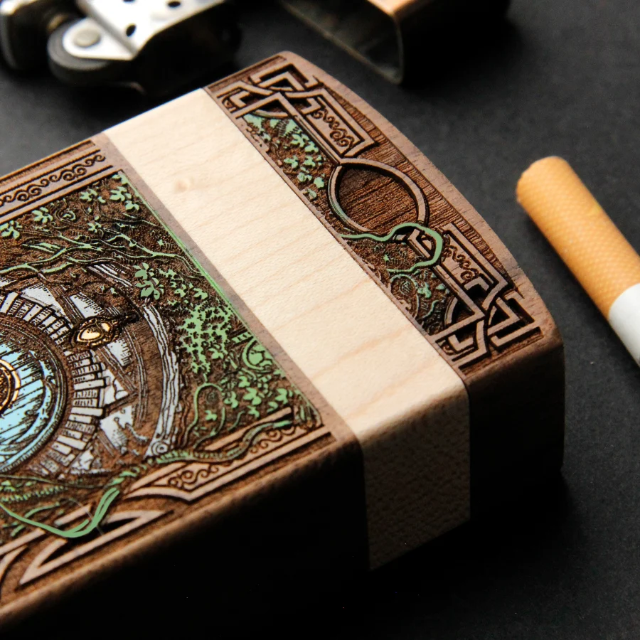 Our cigarette cases are made of genuine natural fir and mahogany wood, engraved with millimeter precision and hand-painted with high-quality acrylic paints,